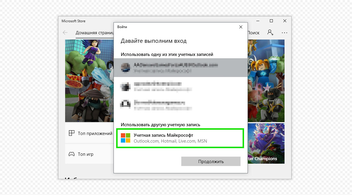 5. В окне "Войти" выберите пункт "Использовать другую учетную запись" -> "Учетная запись Майкрософт". Нажмите кнопку "Продолжить"